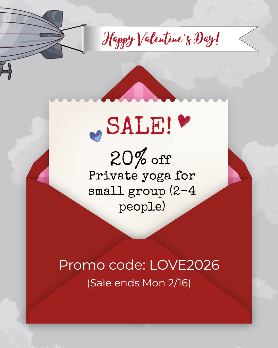 20% off private couple’s or friends’ yoga session or 4 session pass! Use promo code LOVE2026. Check our FAQs if you need help using the promo code. Sale ends 2/16 but session(s) can be scheduled at any time after purchase. Learn more about private yoga sessions here.